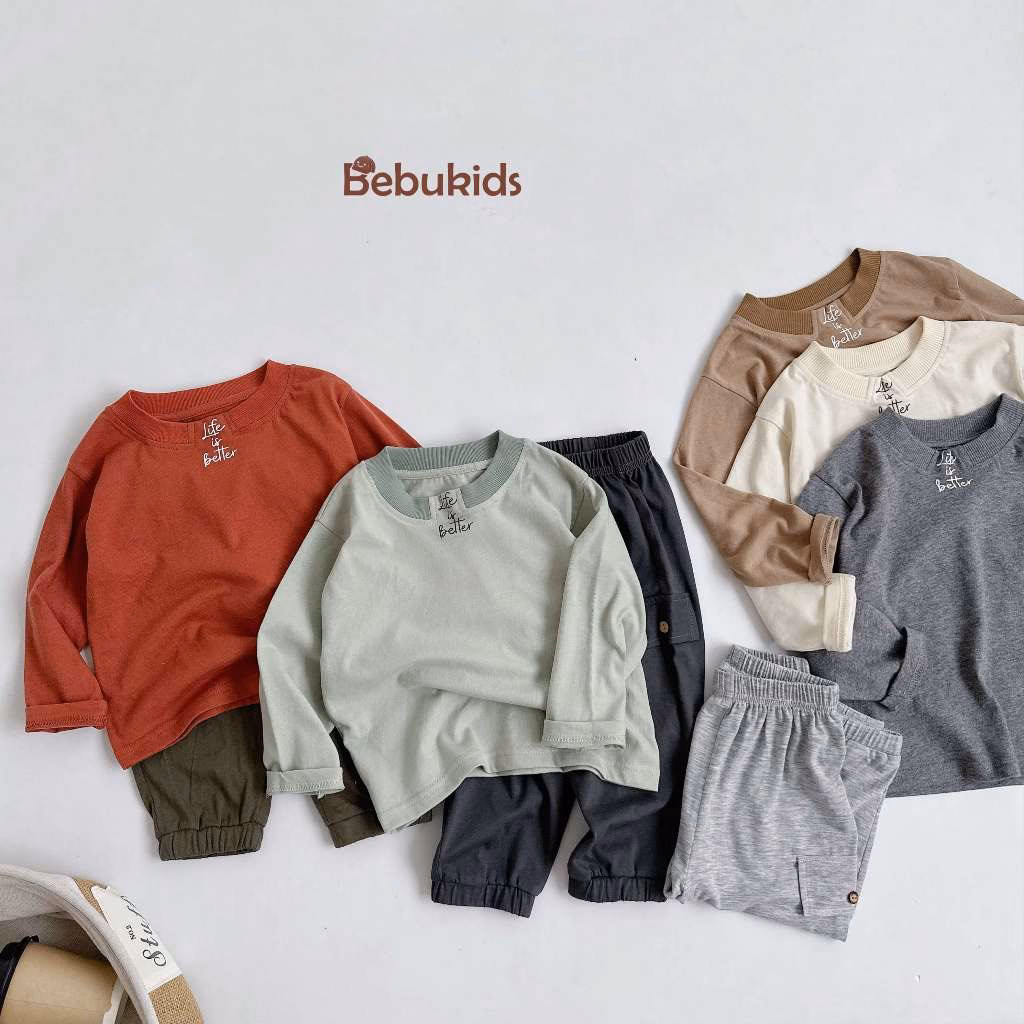 - Tên sản phẩm: Set bộ thu đông cho bé Bebukids chất liệu cotton trơn basic cổ tròn mềm mịn, bé 1-6 tuổi SB1777